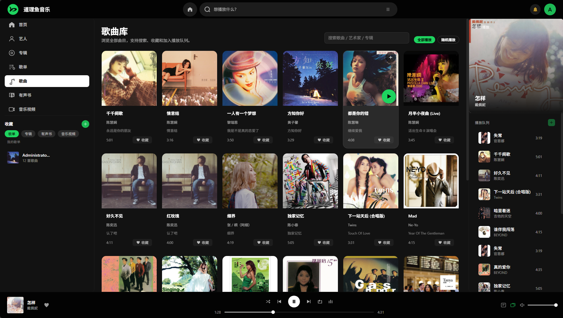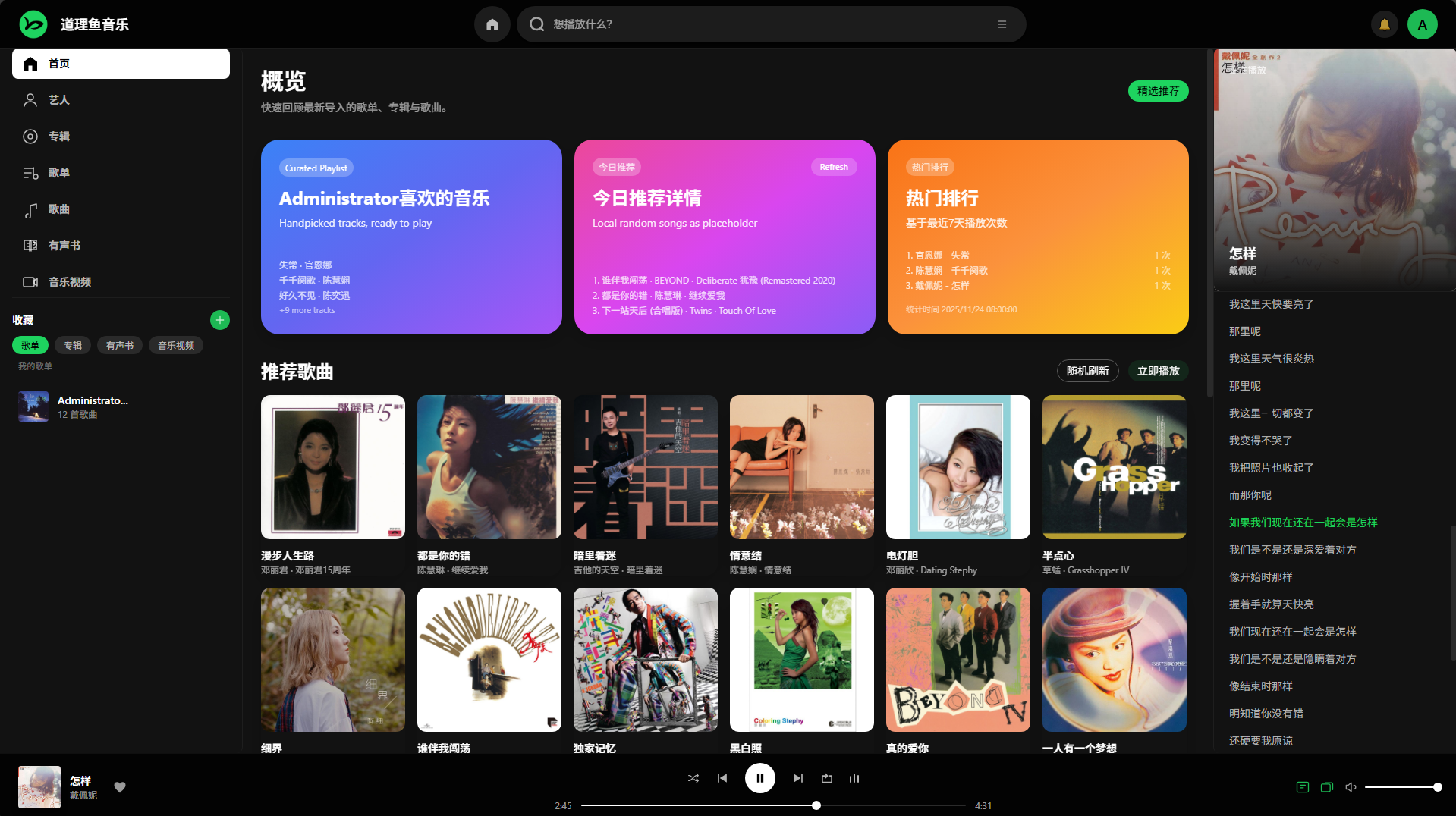 • 智能播放:Web 前端提供队列、收藏、下一首/上一首、音量与进度控制,支持令牌式音频流与 HLS。